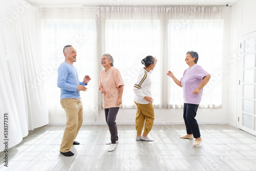 Active Asian senior group mix with man and woman exercise by dancing together at home with relaxing, smiling and laughing. Indoor activity for mature seniors and retirement people.