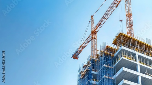 Active construction site with cranes, scaffolding, and building framework under a clear sky, no people visible