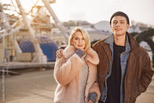 Active day. Waist-up portrait of positive young couple are standing together on the square and looking at camera with joy. They are enjoying spring day. Copy space in the left side