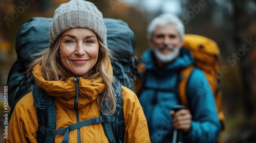 active elderly couple hiking together in mountains portrait of senior tourists walking with trekking poles
