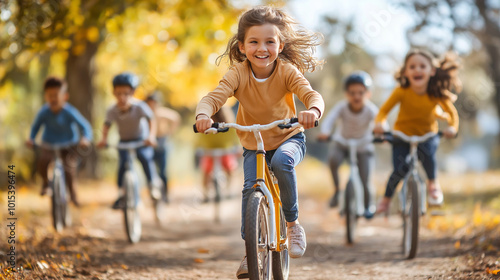 Active Lifestyle, children running, cycling, and jumping in a lively outdoor setting, with copy space, Child Health Day