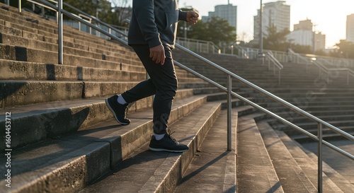 Active Man Descending SunKissed Urban Stairs at Golden Hour.
