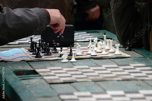 Active people in their free time on vacation with pleasure playing chess on the street. Figures and chess board close-up.