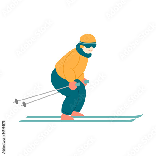Active people skiing. Vector illustration of skier jumping from mountain in action pose isolated on white. Winter extreme sport, competition concept
