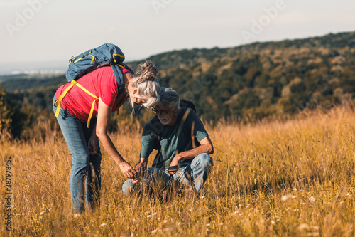 Active senior couple hiking in nature with backpacks, enjoying their adventure in nature.