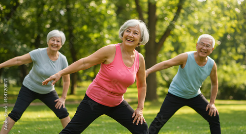 Active senior group exercising outdoors with stretching and smiling faces