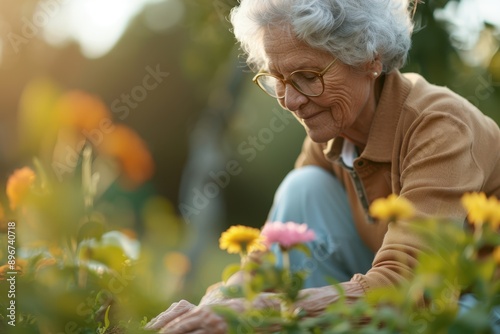 Active Senior Woman Enjoying Vibrant Retirement Pastime of Planting Flowers in Garden