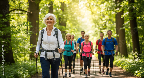 Active Seniors Enjoying a Group Nordic Walk in Nature's Embrace on a Sunny Day