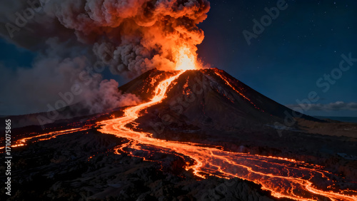 Active volcano eruption with lava flow at night