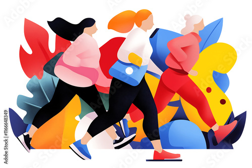Active Women Jogging Through Colorful Nature: A Vibrant Illustration of Fitness and Wellness