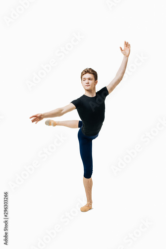 Actor Russian ballet,young ballet dancer performing complex elements on a white background