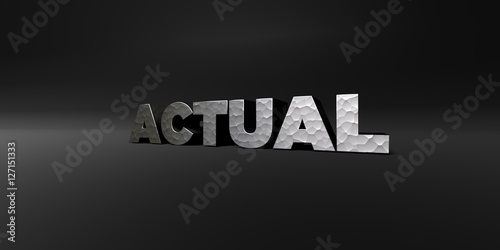 ACTUAL - hammered metal finish text on black studio - 3D rendered royalty free stock photo. This image can be used for an online website banner ad or a print postcard.