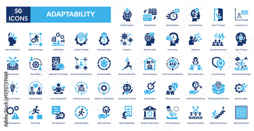 Adaptability Fill Icon Set. Flexible Mindset, Change Ready, Quick Response, Growth Mindset, Open To Change, Learning Curve, Agile Thinking
