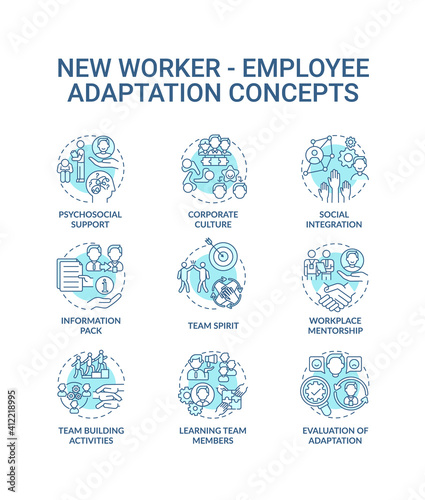 Adaptation of new worker concept icons set. Psychosocial support and team spirit idea thin line RGB color illustrations. Core values and mentorship. Vector isolated outline drawings. Editable stroke
