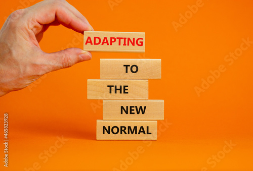 Adapting to the new normal symbol. Wooden blocks with words Adapting to the new normal on beautiful orange background, copy space. Businessman hand. Business, new normal concept.