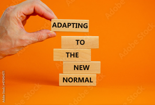Adapting to the new normal symbol. Wooden blocks with words Adapting to the new normal on beautiful orange background, copy space. Businessman hand. Business, new normal concept.