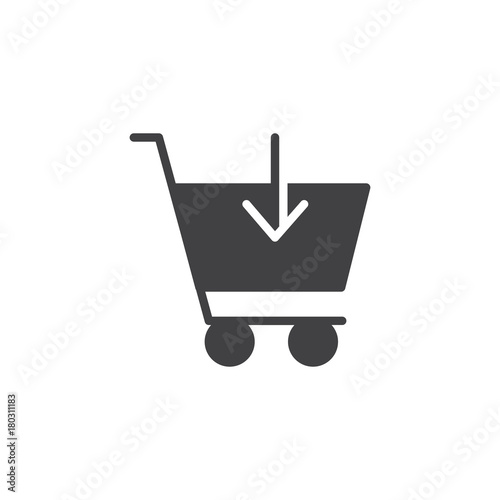 Add to shopping cart icon vector, filled flat sign, solid pictogram isolated on white. Trolley with down arrow symbol, logo illustration.