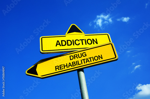 Addiction vs Drug Rehabilitation - Traffic sign with two options - appeal to overcome addictive substance abuse and dependence through detoxifiction, treatment, rehabilitation and abstinence