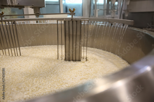Adding water to curd and whey in tank at cheese factory