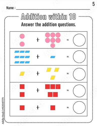 Addition Within 10 Worksheet with Colorful 2D Shapes for Kindergarten to First Grade Students (Printable PDF)