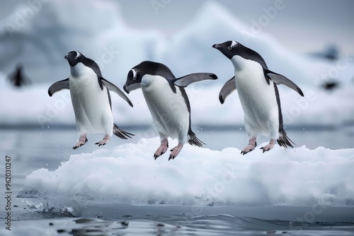 Adelie penguins jumping off an ice floe in the far North Pole, captured in high-definition photography.