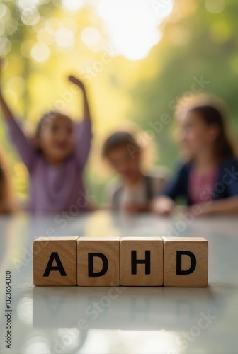 Adhd word written on wooden cubes with playing children in background