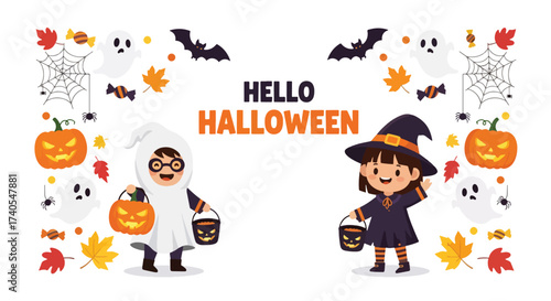 Adobe illustrator artwork vector illustration. Adorable witch and ghost kids trick-or-treating with pumpkins, bats, and spiders. Perfect for banners, invitations, and children's Halloween projects