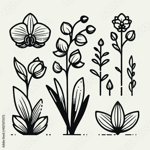Adobe Illustrator Artwork set of contour spring flowers orchid line art floral, leaves black and white illustration Phalaenopsis set of decorative elements of plants stylized Cymbidium, Paphiopedilum