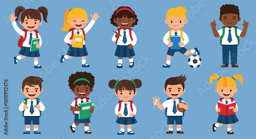 Adobe illustrator vector flat style illustration of a diverse set of elementary school students in uniform, perfect for education, youth, and back-to-school concepts