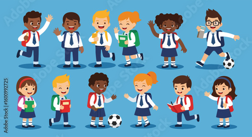 Adobe illustrator vector flat style illustration of a diverse set of elementary school students in uniform, perfect for education, youth, and back-to-school concepts