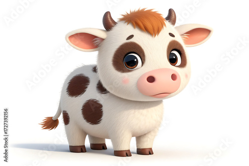 Adorable 3d cartoon calf with big eyes and spotted coat for kids isolated on white background