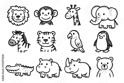Adorable animal doodles featuring safari and forest creatures in sketched style