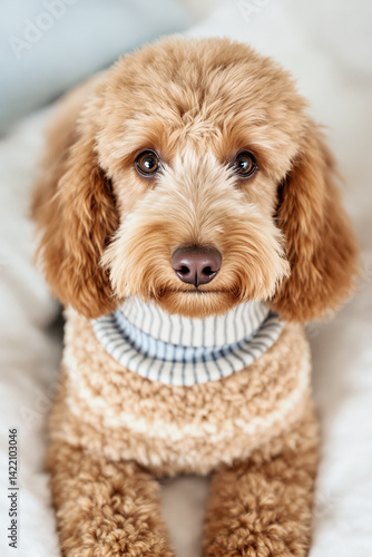 adorable apricot-colored poodle puppy wearing a striped sweater