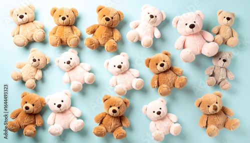 Adorable Arrangement of Plush Teddy Bears on a Light Blue Background, Studio Shot