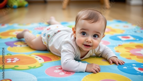 Adorable Baby Boy Crawling On Colorful Play Mat With A Happy Expression Indoors