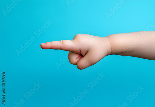 Adorable Baby Hand Pointing, a Cute Gesture Against a Vibrant Blue Background