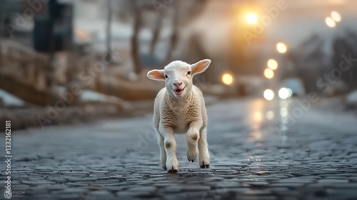 Adorable baby lamb running on cobblestone road at sunset.