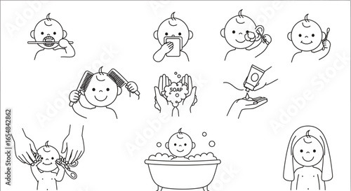 Adorable baby's daily hygiene routines illustrated simply