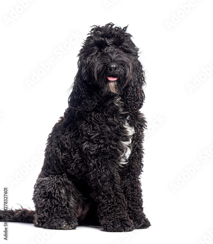Adorable barbet dog sitting and panting on white background