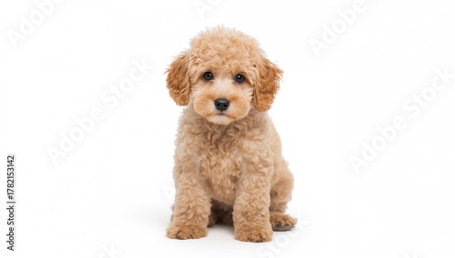 Adorable beige poodle puppy against a white backdrop, ideal for pet-themed projects