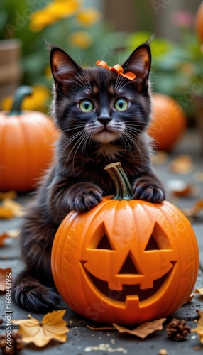 Adorable black kitten with green eyes sitting behind a carved Halloween pumpkin in outdoor autumn setting with fall leaves and pumpkins in background