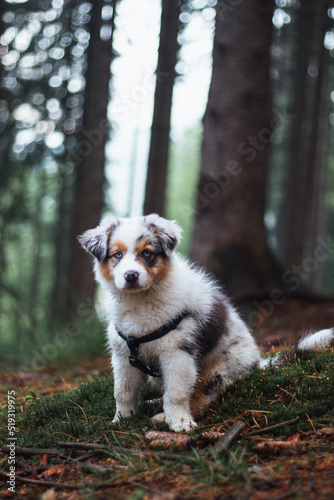 Adorable Blue merle puppy, Australian Shepherd discovering new smells in a beautiful forest. Colorful shaggy dog puppy in the morning forest