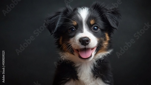 adorable border collie puppy looking happy in a studio portrait, showcasing its charming personality, fluffy fur, and cheerful expression