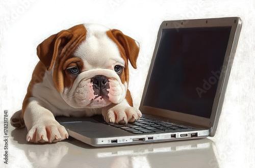 adorable brown and white bulldog puppy lying down with paws on laptop keyboard looking curious and thoughtful