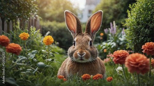 Adorable brown bunny rabbit sitting amidst vibrant orange and yellow flowers in a lush garden.