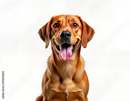 Adorable brown dog with open mouth, visible tongue. Cute pet smiling broadly. Indoor studio shot with isolated white background. Daylight. Close-up portrait. Perfect for pet care education concepts.