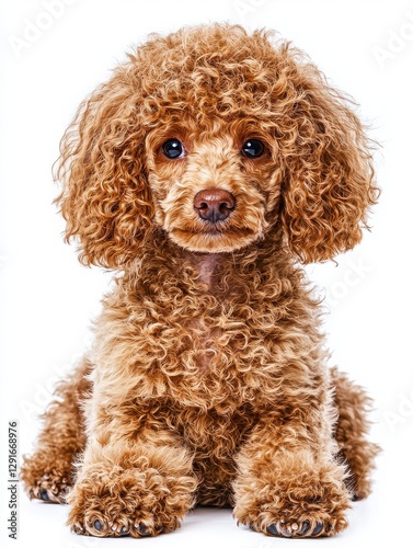 Adorable brown poodle dog sitting gracefully with a charming expression in a beautiful outdoor green park setting
