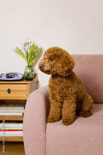Adorable Brown Poodle Sitting on a Pink Sofa in a Cozy Living Room