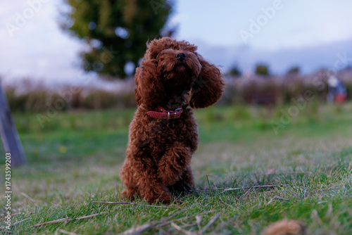 Adorable Brown Poodle Standing Elegantly with Ears Flopped on a Gorgeous Green Landscape Under a Beautiful Sky at Dusk