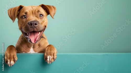 Adorable brown puppy with a happy expression peeking over a teal surface against a green background.